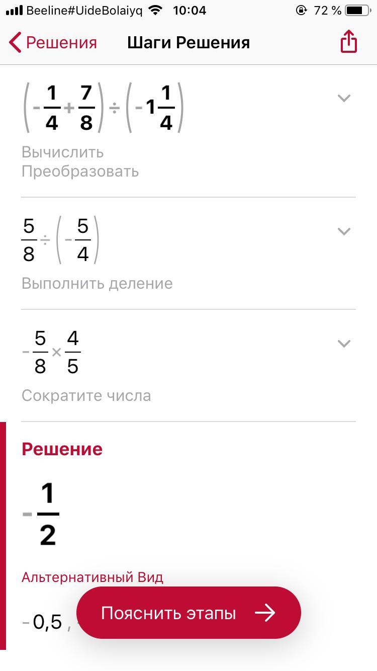 5/8 : (-1 1/4) =5/8 : (-5/4) = 5/8 × 4/5 =1/2