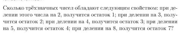 Сколько трёхзначных чисел при делении на 2 дают остаток 1, на 3 2, на 4 3, на 5 4, на 6 5,на 7 6, на 8 7