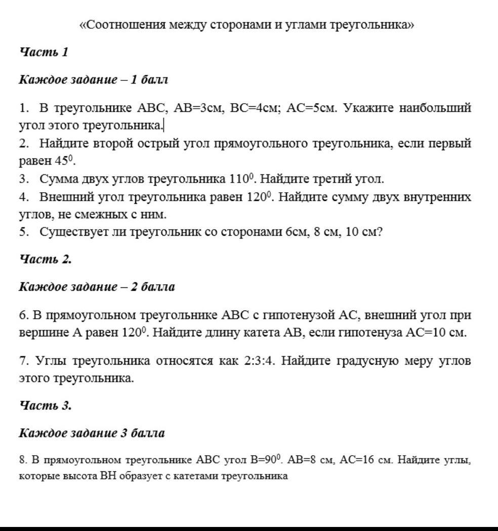 8. Если АВ в 2 раза меньше АС, значит угол С=30 градусов, угол А=60 градусов, отсюда следует что высота ВН образует с катетом АВ угол=30 градусов, с катетом ВС угол=60 градусов.