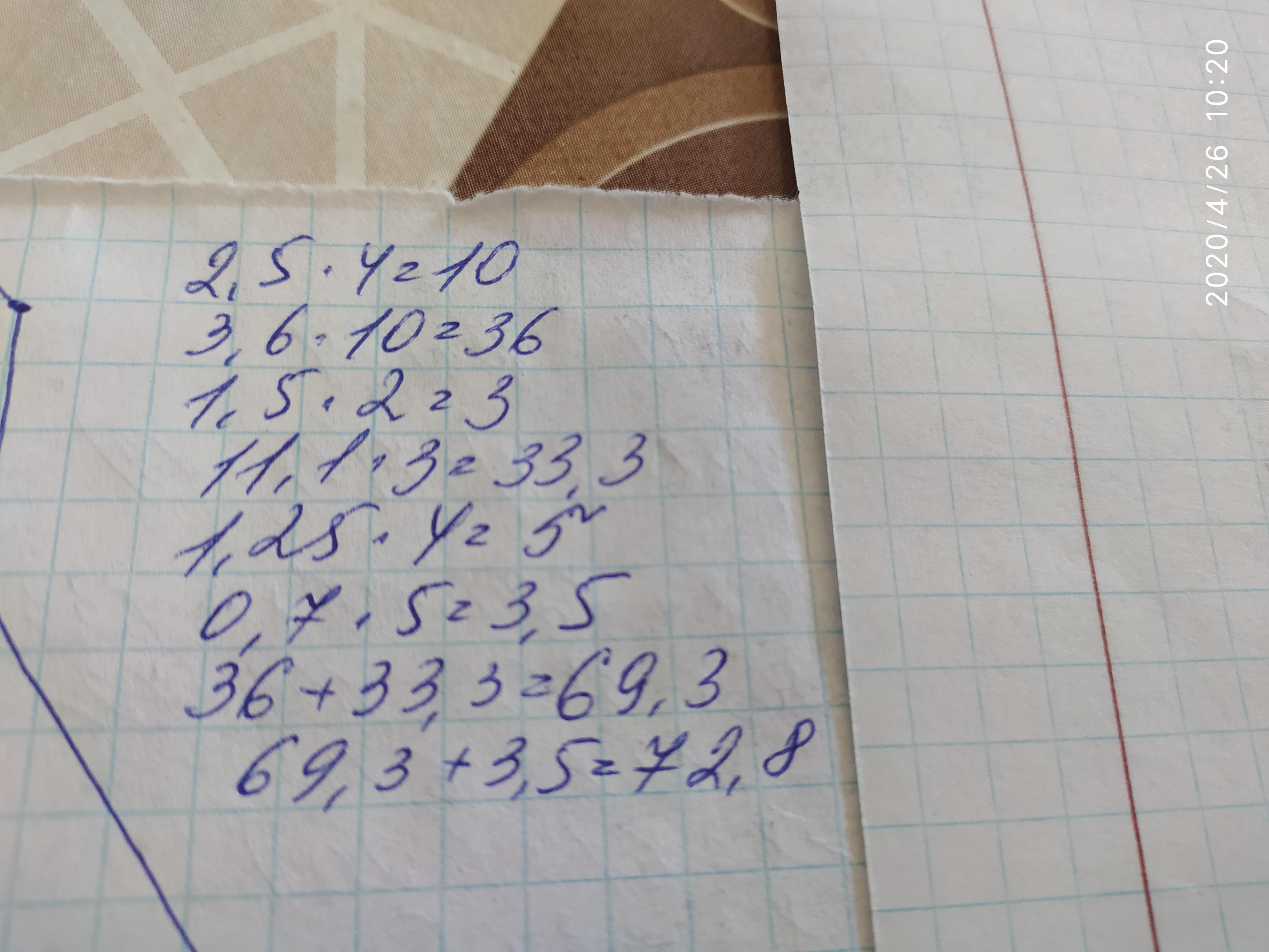 2,5 × 3,6 × 4 + 1,5 × 11,1 × 2 + 4 × 0,7 × 1,25.