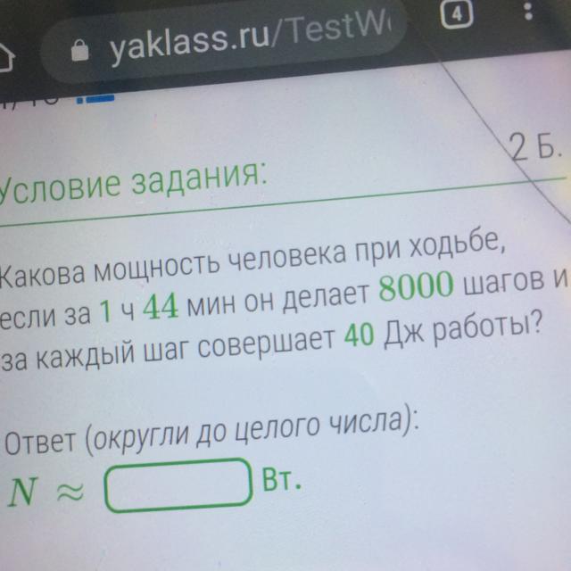 Какова мощность человека при ходьбе ,если за 1ч 44 мин он делает 8000 шагов и за каждый шаг совершает 40 Дж работы ?