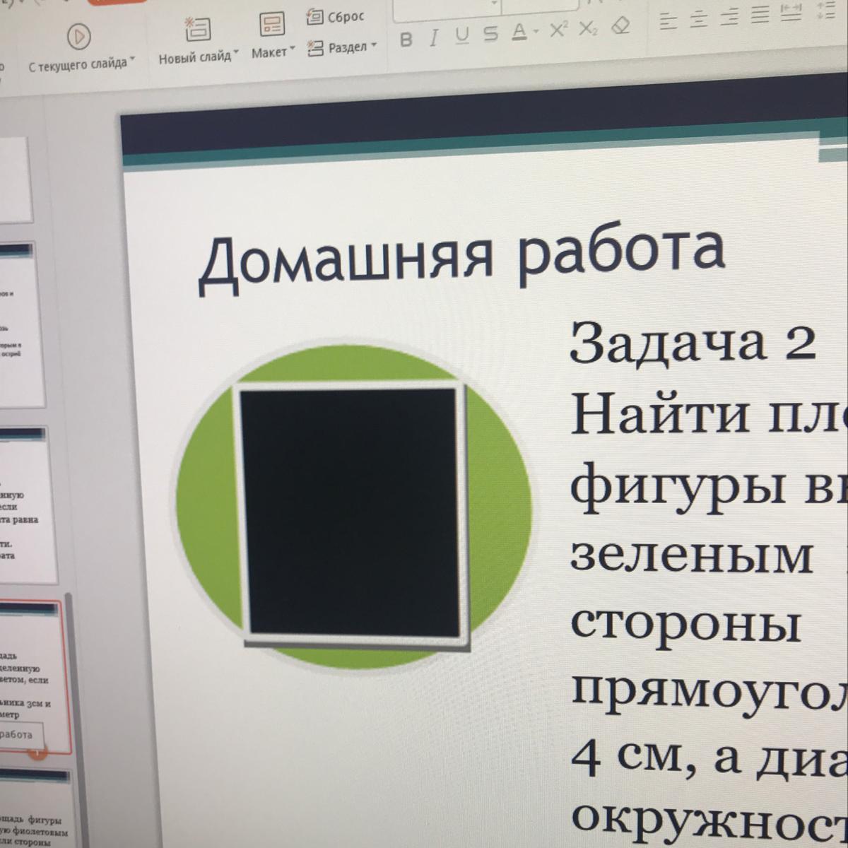 Найти площадь фигуры выделенную зелёный цветом, если стороны прямоугольника 3 см и 4 см, а диаметр окружности 5 см?