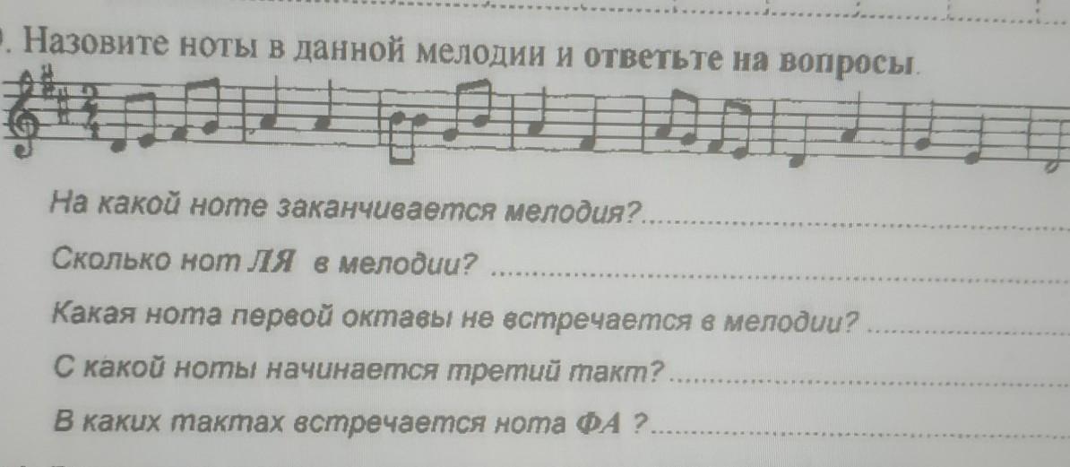 Первый такт: ре ми фа соль. Второй такт: ля ля. Третий такт:си си соль си. Четвертый такт: ля фа. Пятый такт:ля соль фа ми. Шестой такт:ре ля. Седьмой такт:соль ми. Восьмой такт:ре