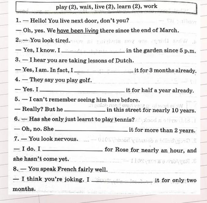 2 has been working 3 has been learning 4 has been playing 5 has been living 6 has been playing learning 7 has been waiting 8 has been learning