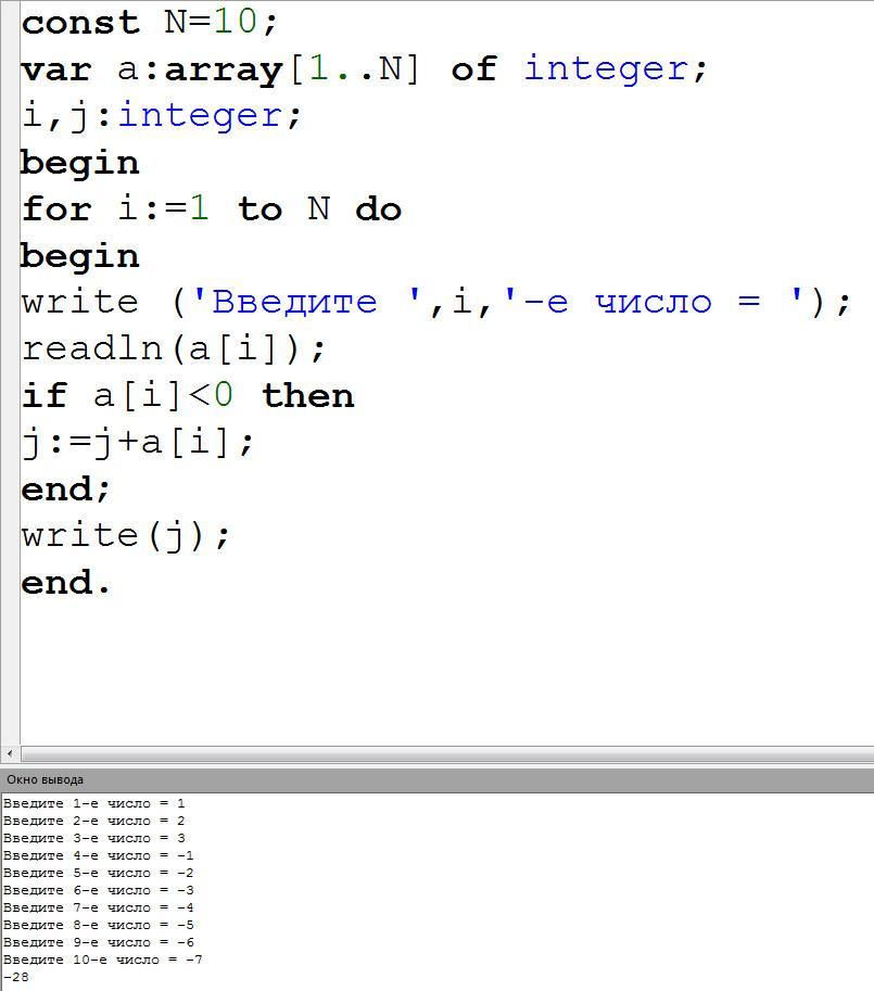СРОЧНО!!!Дан массив из N целых чисел. Найти сумму всех отрицательных чисел. Создать программу на Паскаль