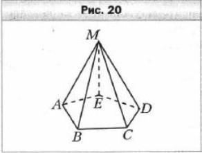 На рисунке 20 изображена пирамида MABCDE. Укажите: 1) основание пирамиды; 2) вершину пирамиды; 3) боковые грани пирамиды; 4) боковые рёбра пирамиды; 5) рёбра основания пирамиды; 6) боковые грани, для которых ребро ME является общим.