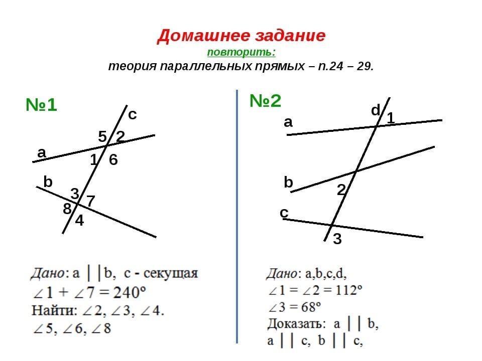 Дано: a | | b, c - секущая, угол 1 + угол 7 = 240 градусов. Найти: угол 2, угол 3, угол 4, угол 5, угол 6, угол 8