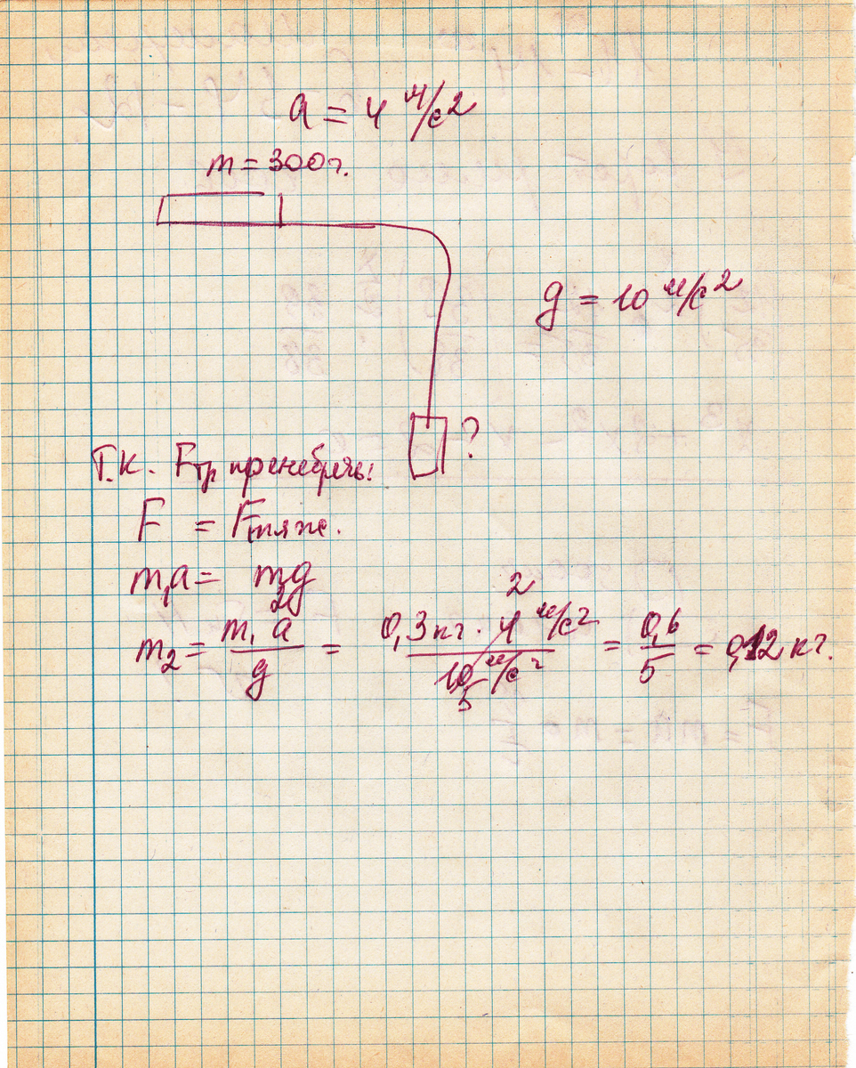 2) На горизонтальном столе лежит брусок, m1=300 г, к нему привязано тело, и оно свешивается через край стола. Найдите массу этого тела, если ускорение равно 4м/с^2. Трением пренебречь. g= 10 м/с^2. Ответ дать в системе СИ , округлив до сотых.