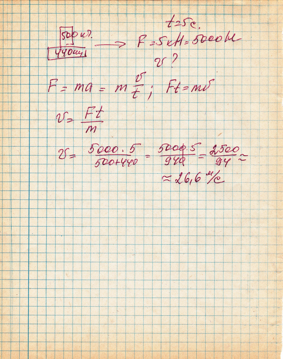 Какую скорость наберет тележка за 5 секунд если сила тяги = 5кН. Трением пренебречь.