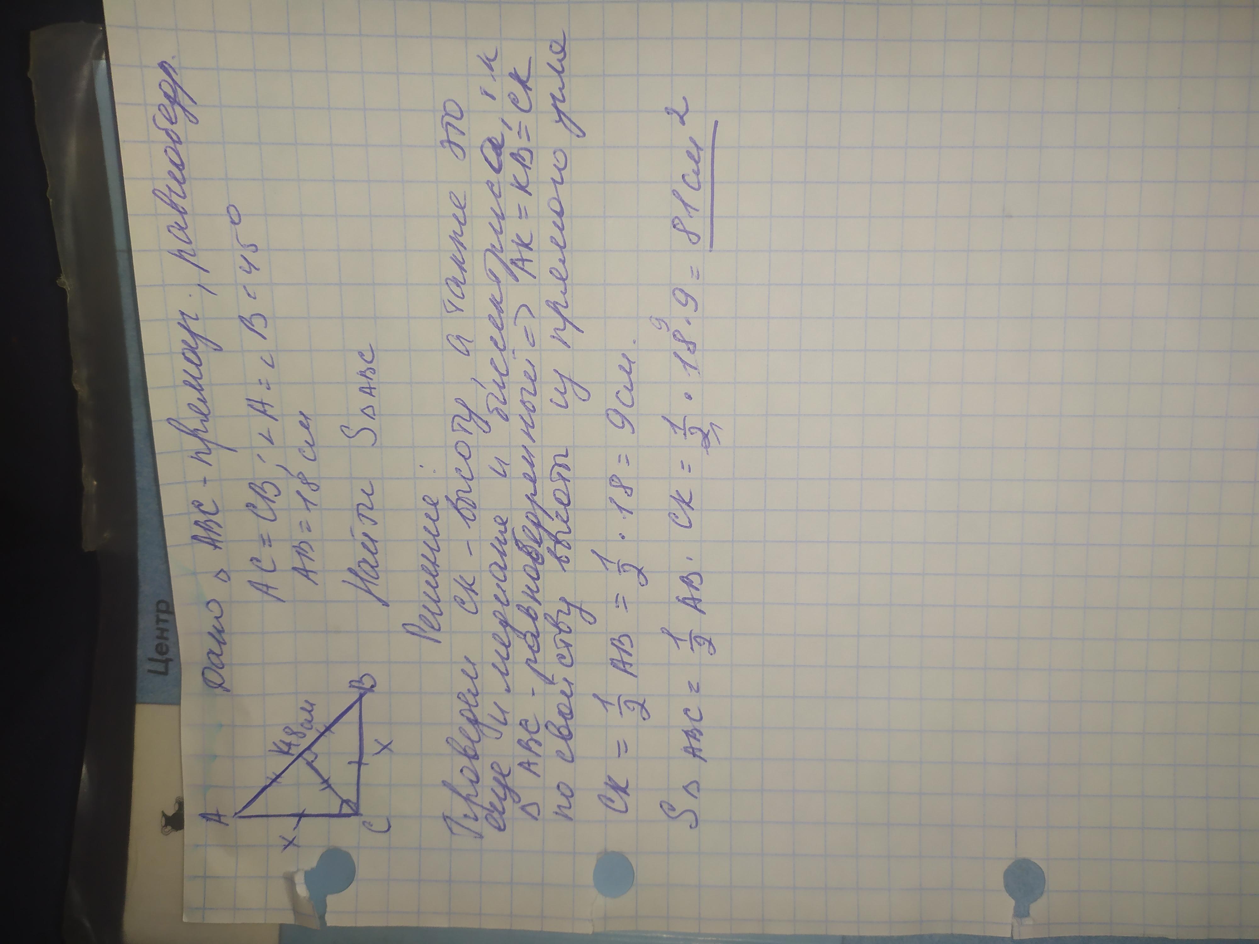 Знайдіть площу рівнобічного прямокутного трикутник, гіпотенуза якого дорівнює 18 см
