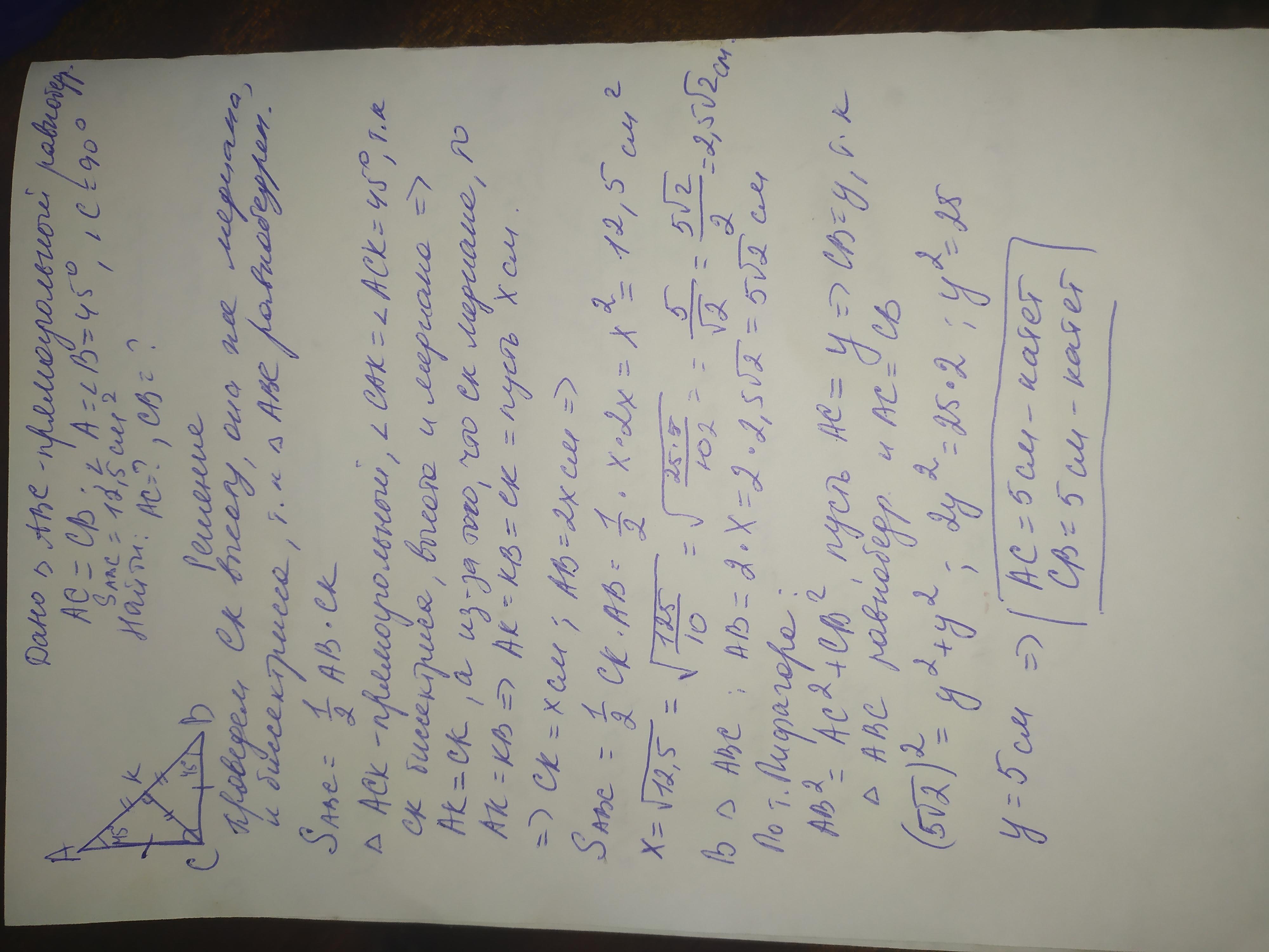40 баллов !!! Знайдіть катети прямокутного рівнобічного трикутника, якщо його площа дорівнює 12,5 см²