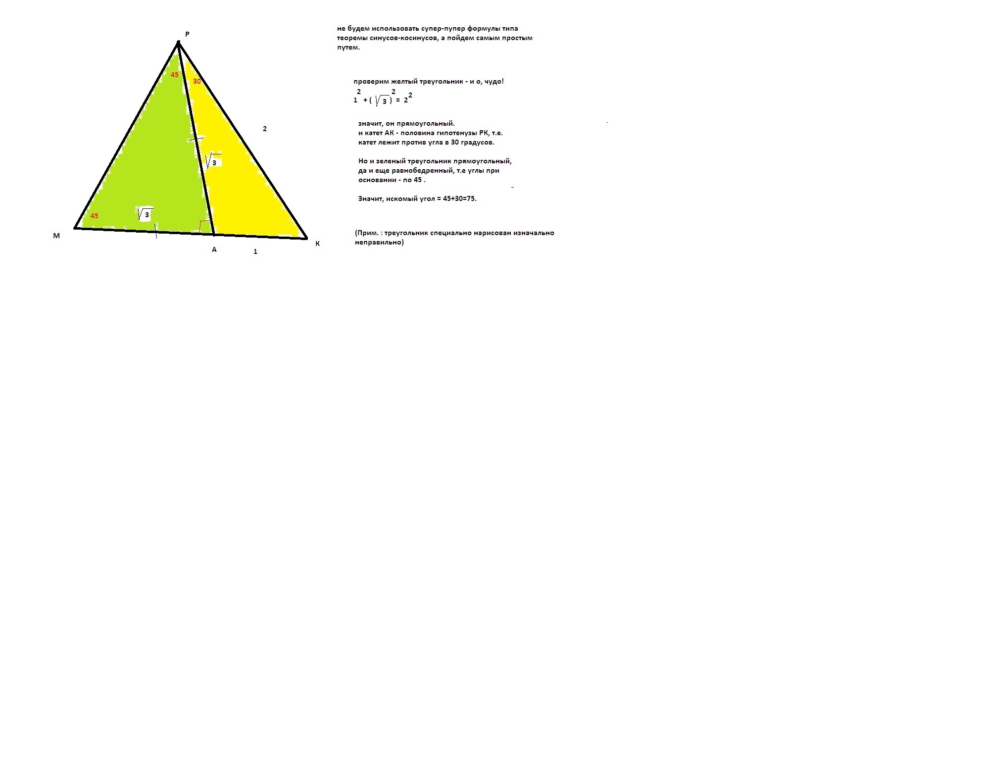 В треугольнике MPK: PK=2. На стороне MK отмечена точка A так,что MA=AP=√3, AK=1. Найдите угол MPK.