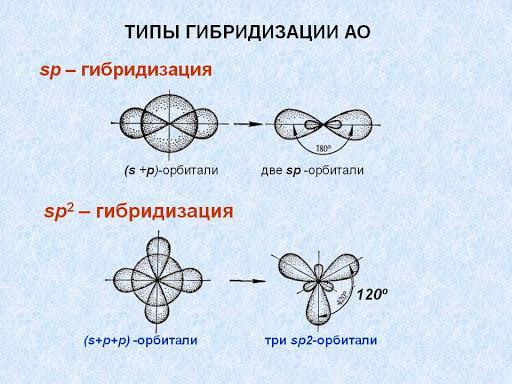 sp2-Гибридизация Одна s- и две p-орбитали смешиваются, и образуются три равноценные sp2-гибридные орбитали, расположенные в одной плоскости под углом 120° (выделены синим цветом). Они могут образовывать три σ-связи.