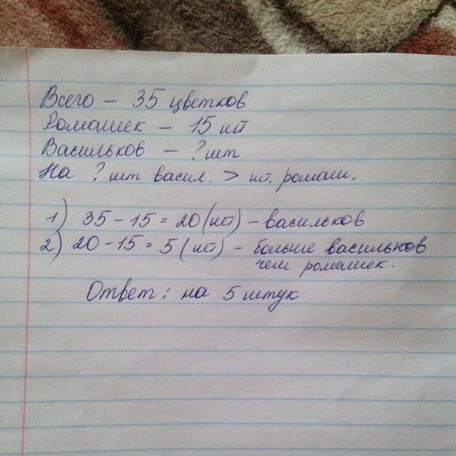 В букете у юли было 35 цветков. ромашки и васильки. на сколько больше было васильков если ромашек было 15?Помогите решить задачу с условиями