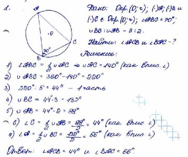 Вершины треугольника АВС лежат на окружности с центром О, АВС = 70°, ВС : АВ = 2 : 3. Найдите углы треугольника АОВ.