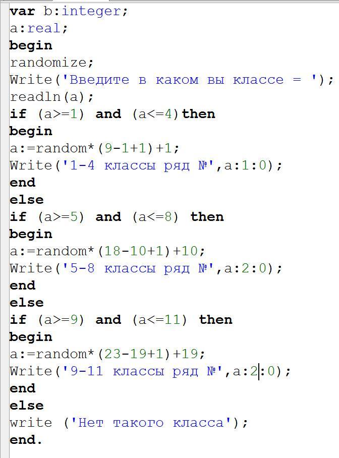 В кинотеатре для просмотра фильма отведены ряды под возрастные категории школьников: 1-4 классы, 5-8 классы и 9-11 классы. Номера рядов в билетах для каждой категории лежат в пределах: для 1-4 классов - с 1 по 9 ряды; для 5-8 классов - с 10 по 18 ряды; для 9-11 классов - с 19 по 23 ряды. С помощью компьютера выберите случайным образом билеты в кинотеатр с рядами в каждой возрастной категории.