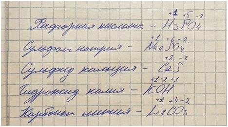Написать формулы веществ и рассчитать степени окисления элементов в веществах: фосфорная кислота, сульфат натрия, сульфид кальция, гидроксид калия, карбонат лития. Степени окисления определить по уравнению