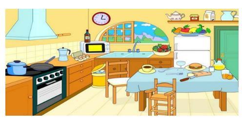 Бұл ас бөлмесінің суреті. Бөлмеде ас ішетін үстел тұр, ал оның жанында орындықтар тұр. Үстелдің устінде дастархан жайылып тұр. Газ плитаның үстінде таба, ал табаның жанында қазан. Бөлменің жоғарғы бұрышында сағат уақытты көрсетіп тұр. Үстелдің жанында тоңазатқыш тұр, ал онын үстінде тәрелкеде жеміс жидектер бар. Ал тоңазатқыштың сол жағында кәмпиттер салынған тәрелке тұр.