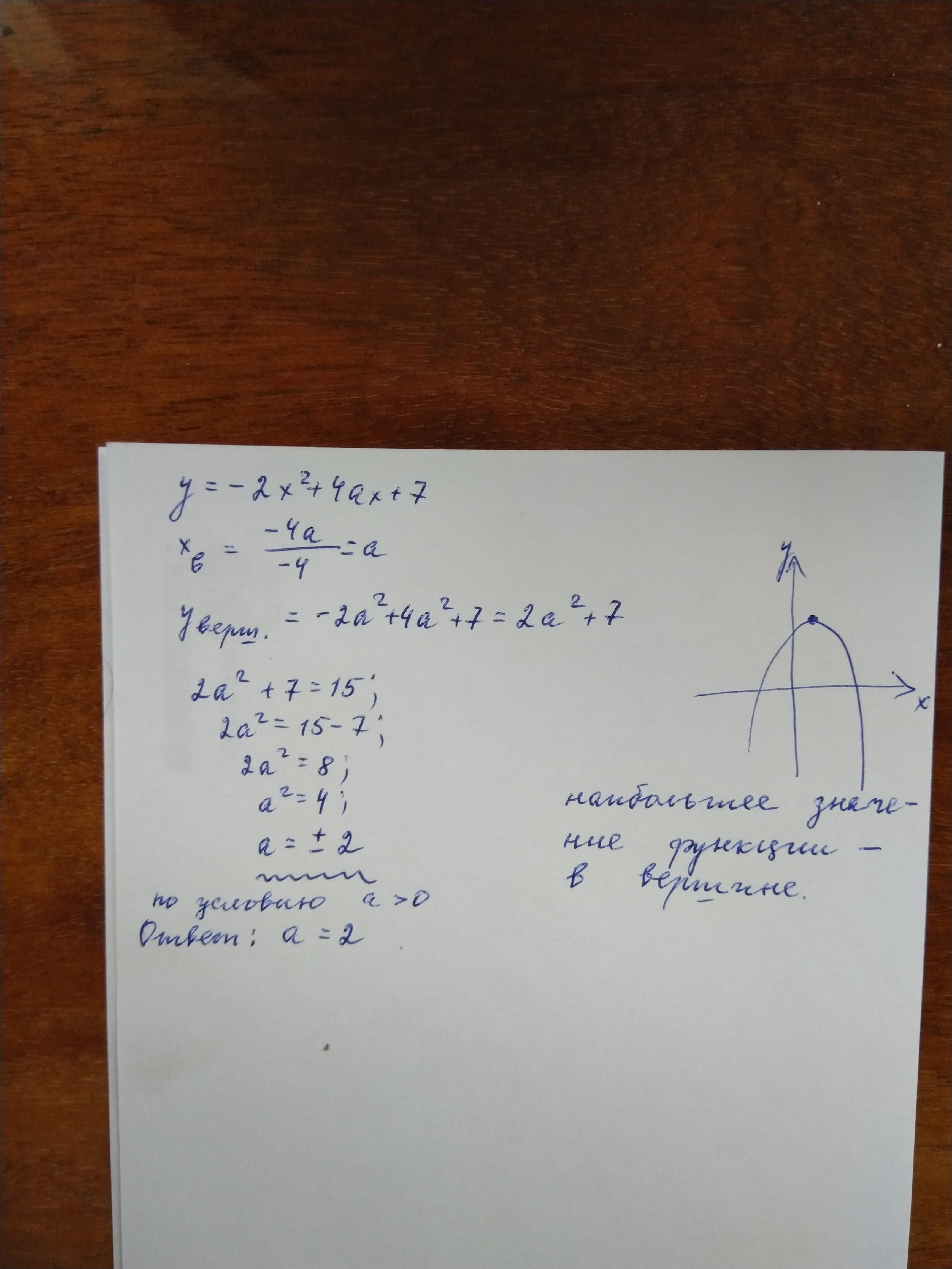 при каком положительном значении а функция y = -2x^2+4ax+7 имеет наибольшие значение, равное 15? помогите пожалуйста!!!!!!!