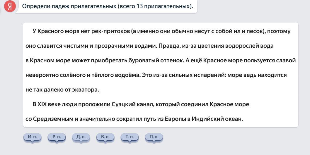Красного- П.п.Собой-Т.п, Чистыми-Т.п, Прозрачными-Т.п, Красном-П.п, буроватый-И.п, Красное- И.п, Солёного-Р.п, Тёплого-Р.п, Сильных-Р.п, Суэцкий-И.в,Красное-И.п.