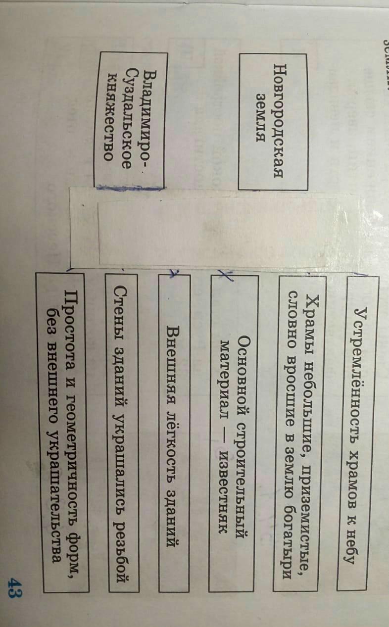 Проведите соединительные линии двух цветов красным цветом отметьте особенности архетектуры Владимиро-Суздальского княжества, синим Новгородской земли.