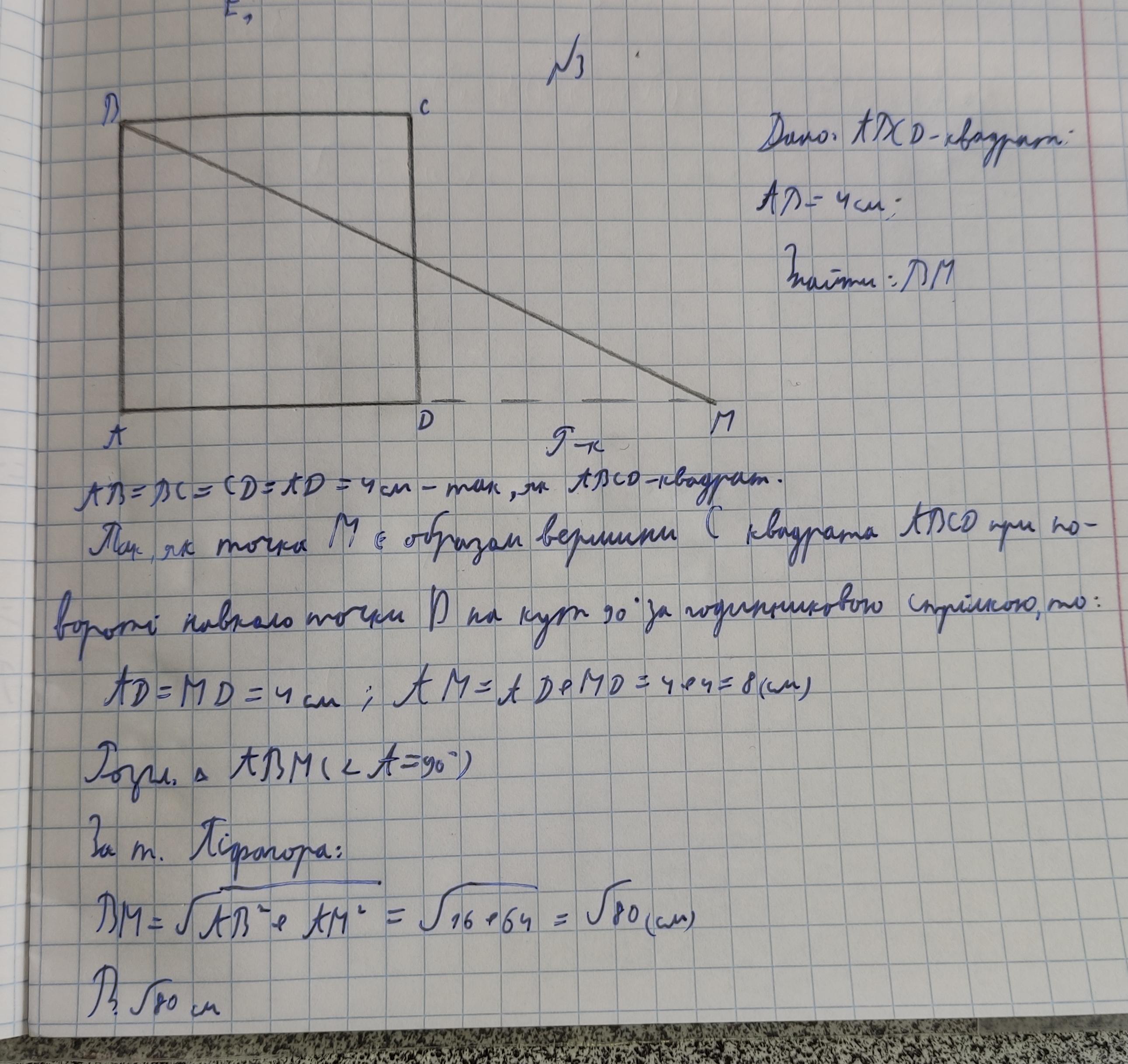 точка М є образом вершини С квадрата ABCD при повороті навколо точки D на кут 90 градусів за годинниковою стрілкою. Знайдіть відрізок BM, якщо AB= 4 см
