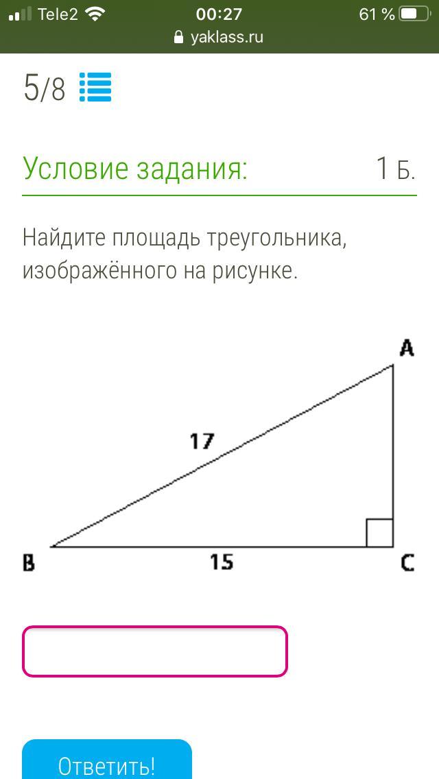 Пот еореме Пифагора находим ас=корень289-225=корень64=8см тогда площадь =(8*15)/2=60см*2