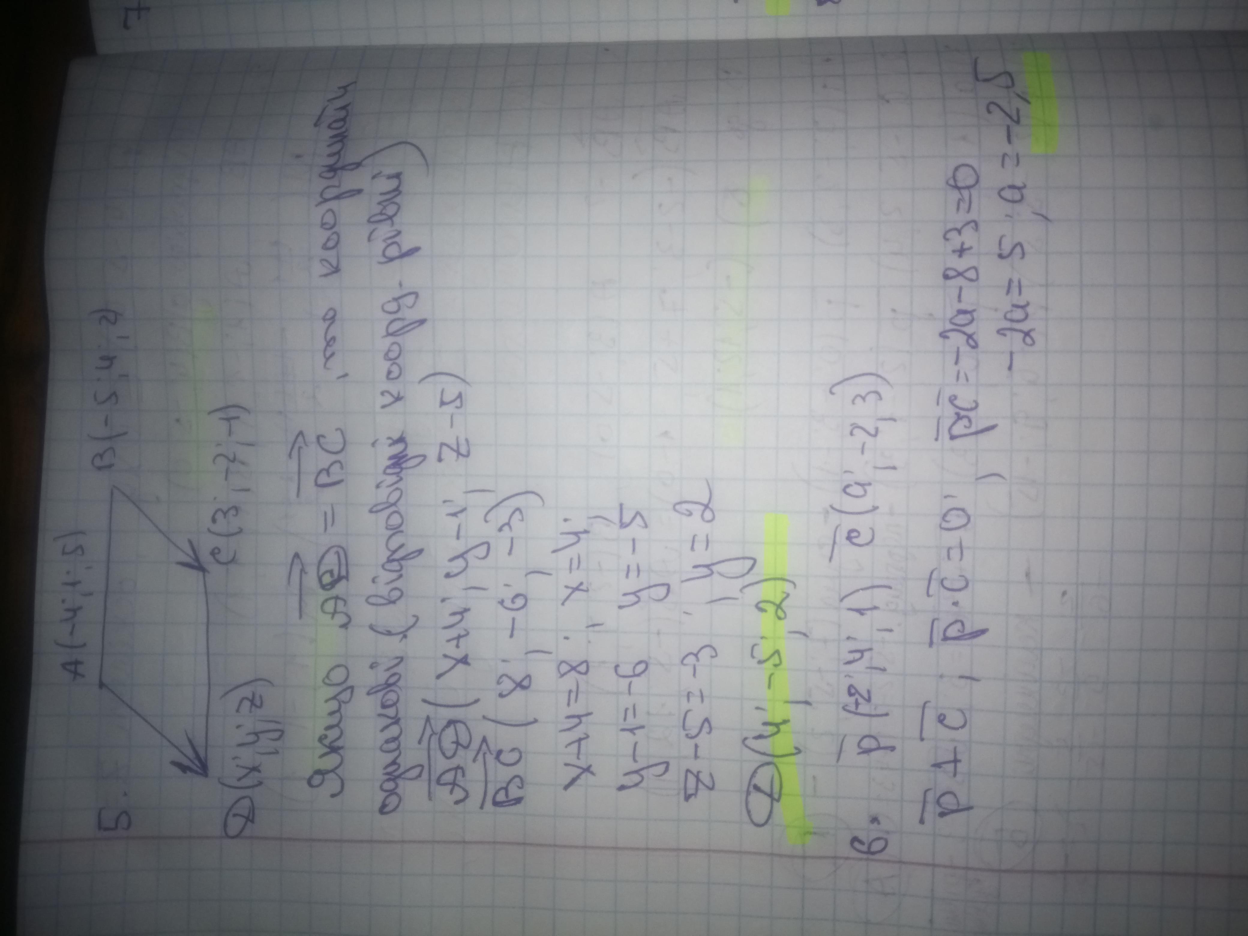 5. Дано АВСD – паралелограм. А(-4;1;5), В(-5;4;2), С( 3;-2;-1). Знайти координати вершини D.
