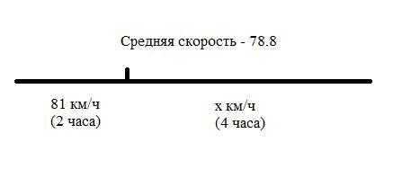 Поезд ехал из одного города в другой со средней скоростью 78,8 км /ч. Первые 2 ч он ехал со скоростью 81 км /ч, а затем снизил скорость и через 4 ч после этого прибыл в пункт назначения. С какой скоростью ехал поезд последние 4 ч?