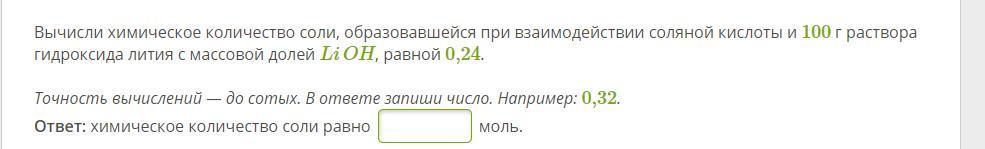 1.Вычисли химическое количество соли, образовавшейся при взаимодействии соляной кислоты и 100 г раствора гидроксида лития с массовой долей LiOH, равной 0,24.