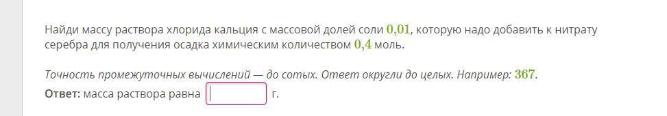 3.Найди массу раствора хлорида кальция с массовой долей соли 0,01, которую надо добавить к нитрату серебра для получения осадка химическим количеством 0,4 моль.