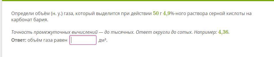 2.Определи объём (н. у.) газа, который выделится при действии 50 г 4,9%-ного раствора серной кислоты на карбонат бария.