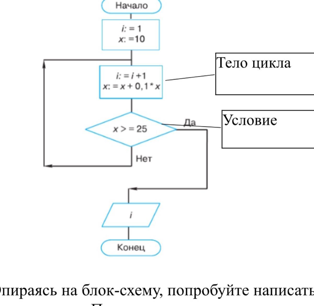 Опираясь на блок-схему, попробуйте написать программу на Паскале для решения задачи о тренировках спортсмена, используя оператор Repeat.