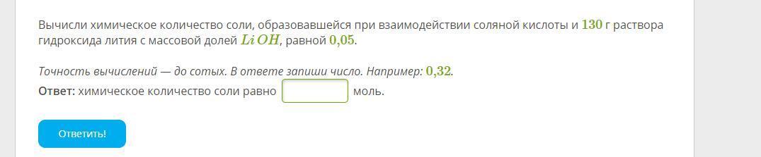 1.Вычисли химическое количество соли, образовавшейся при взаимодействии соляной кислоты и 130 г раствора гидроксида лития с массовой долей LiOH, равной 0,05.