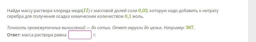 2.Найди массу раствора хлорида меди(II) с массовой долей соли 0,02, которую надо добавить к нитрату серебра для получения осадка химическим количеством 0,1 моль.