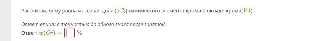 1.Рассчитай, чему равна массовая доля (в %) химического элемента хрома в оксиде хрома(VI).