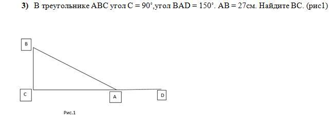 3) В треугольнике АВС угол С = 90˚,угол ВАD = 150˚. АВ = 27см. Найдите ВС. (рис1)