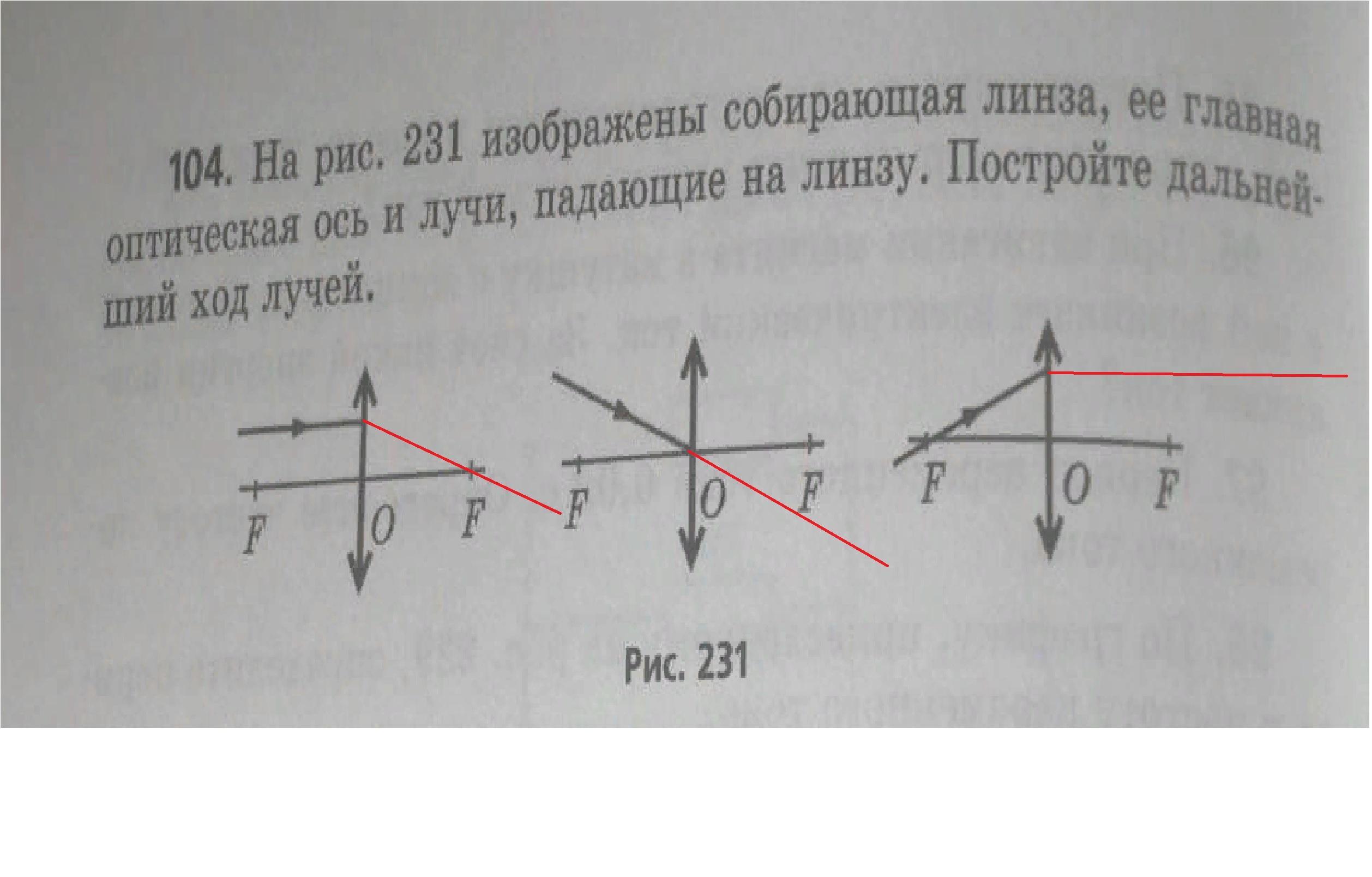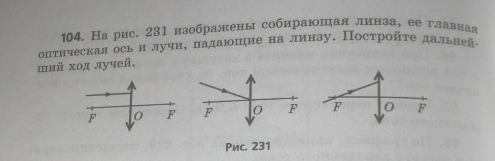 На рисунке 231 изображены собирающая линза, ее главная оптическая ось и лучи, падающие на линзу. Постройте дальнейший ход лучей.