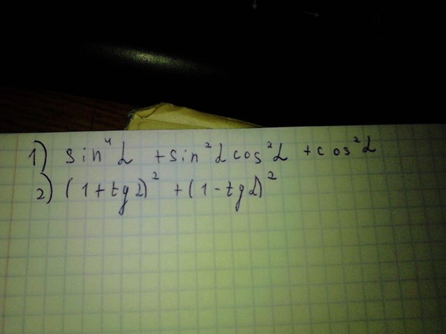 1.; ;sin^4 alpha +sin^2 alpha cos^2 alpha +cos^2 alpha =\=sin^2 alpha (sin^2 alpha +cos^2 alpha )+cos^2 alpha =\\=sin^2 alpha cdot 1+cos^2 alpha =1\\2.; ; (1+tg  alpha )^2+(1-tg alpha )^2=1+2tg alpha +tg^2 alpha +1-2tg alpha +tg^2 alpha =\=2(1+tg^2 alpha )=frac{2}{cos^2 alpha }