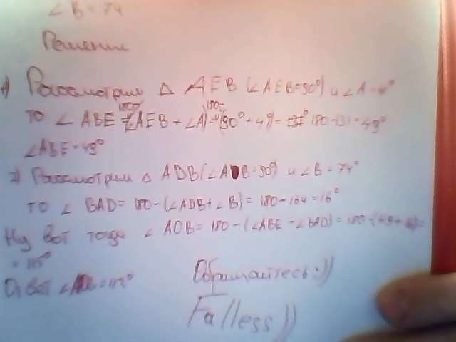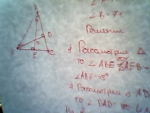 В треугольнике АВС угол А равен 41°, угол В равен 74°, высоты AD и BE пересекаются в точке О. Найдите угол АОВ. Ответ дайте в градусах.