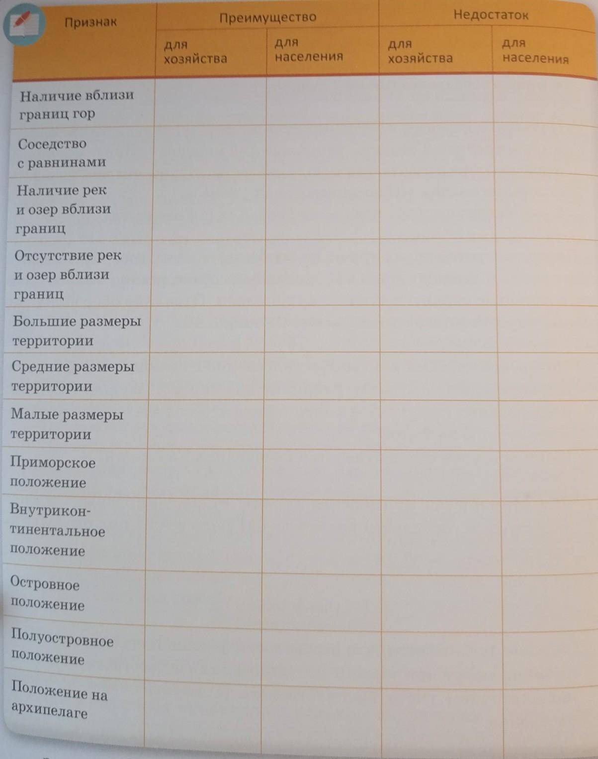 Задание 1. Считается, что особенности физико-географического положения могут при умелом использовании способствовать или при недостаточном учете препятствовать развитию хозйства, жизни населения. Предположите преимущества и недостатки следующих свойств физико-географического положения стран: