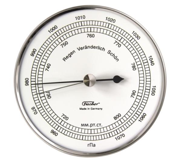 Атмосферное давление измерили с помощью барометра-анероида (см. положение тонкого конца чёрной стрелки на изображении). Выберите все верные записи показаний барометра с учётом погрешности измерения. Считать, что абсолютная погрешность в данном случае равна цене деления для каждой шкалы (неправильно ответите прибью)