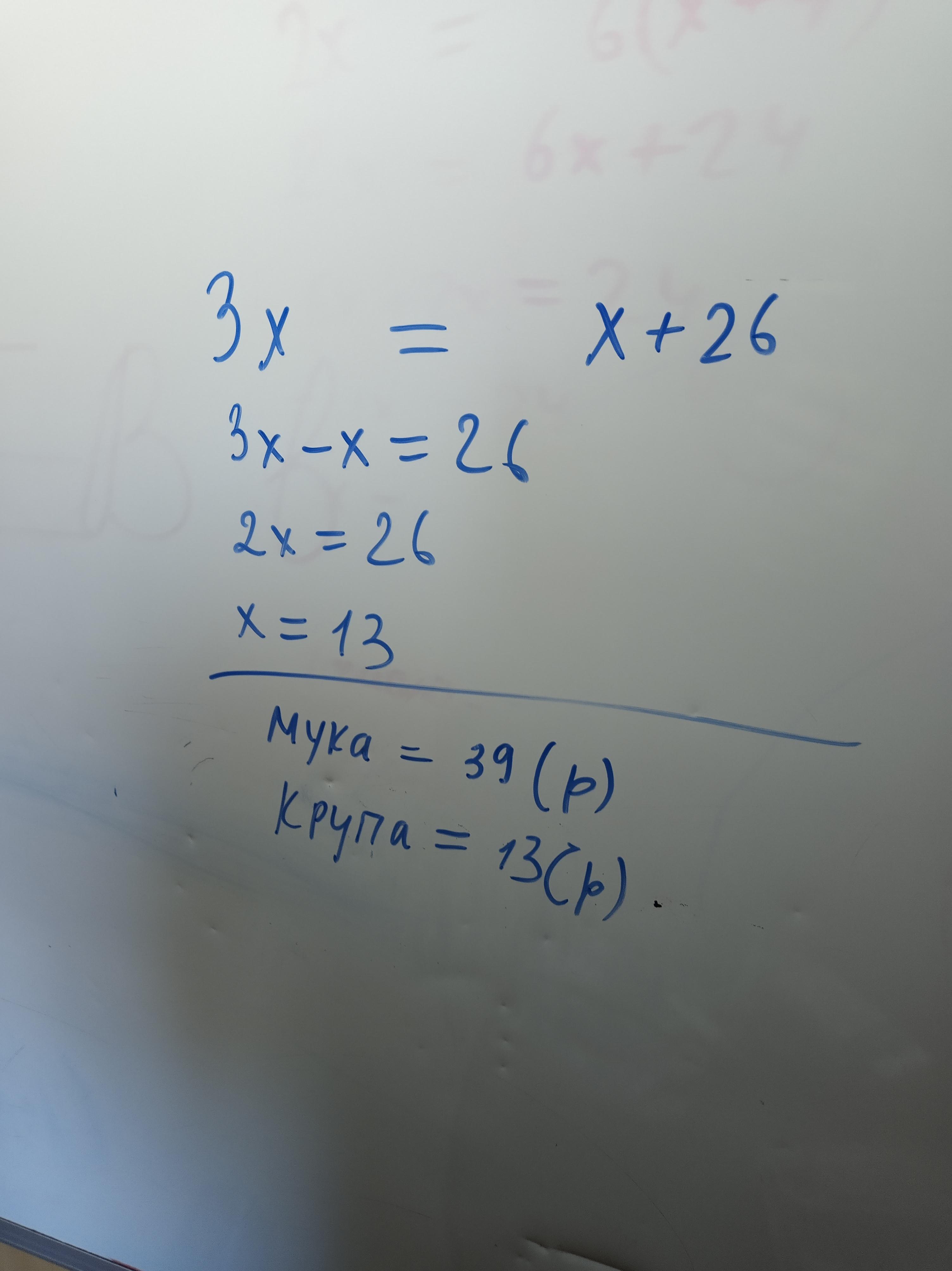 За муку заплатили в 3 раза больше или на 26 рублей больше чем за крупу. Сколько заплатили за крупу и муку отдельно