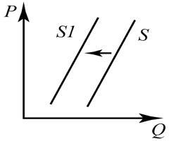 Ситуация на рынке мебели: линия предложения S переместилась в новое положение S1. ( На графике P – цена товара, Q– количество товара.)