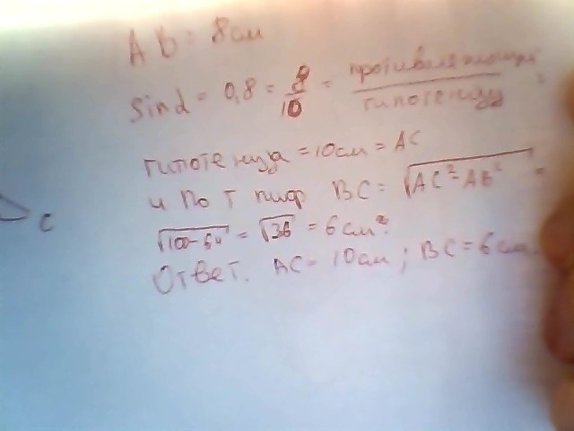 найдем гипотенузу AB: sinA= BCAB AB=8 ,8=10 см