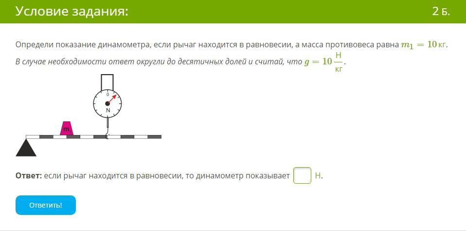 Определи показание динамометра, если рычаг находится в равновесии, а масса противовеса равна m1=10кг.