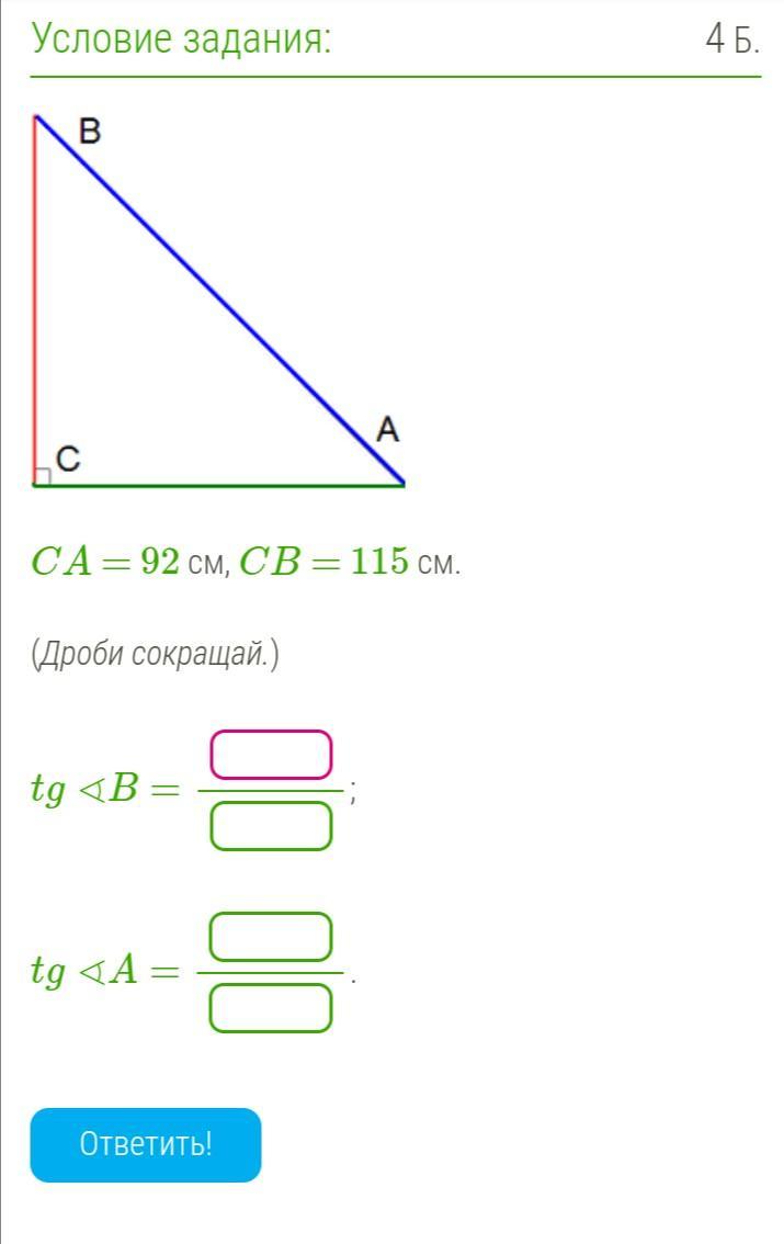 CA = 92 см, CB = 115 см. (Дроби сокращай.)