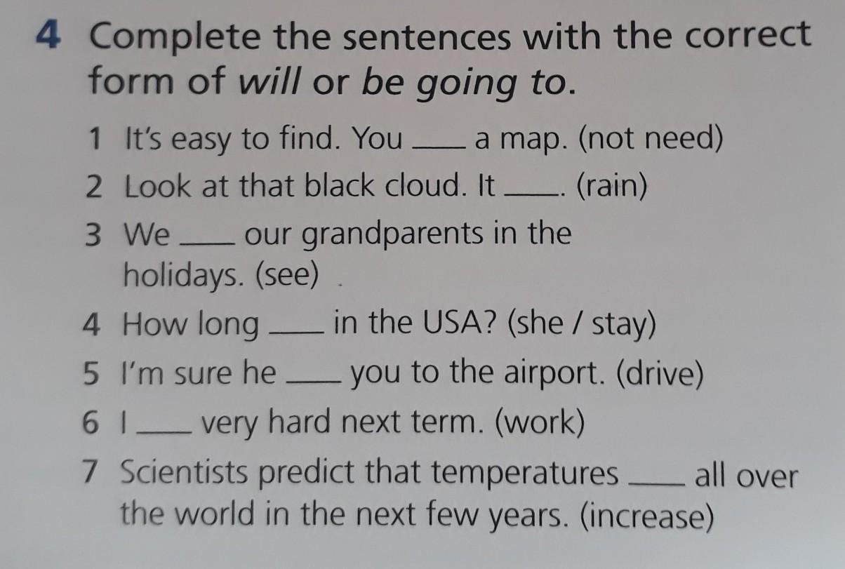 1 will not need 2 It is going to rain 3 We are going to see 4How long will she stay in the USA? 5 he will drive you 6I am going to work very hard 7 will increase