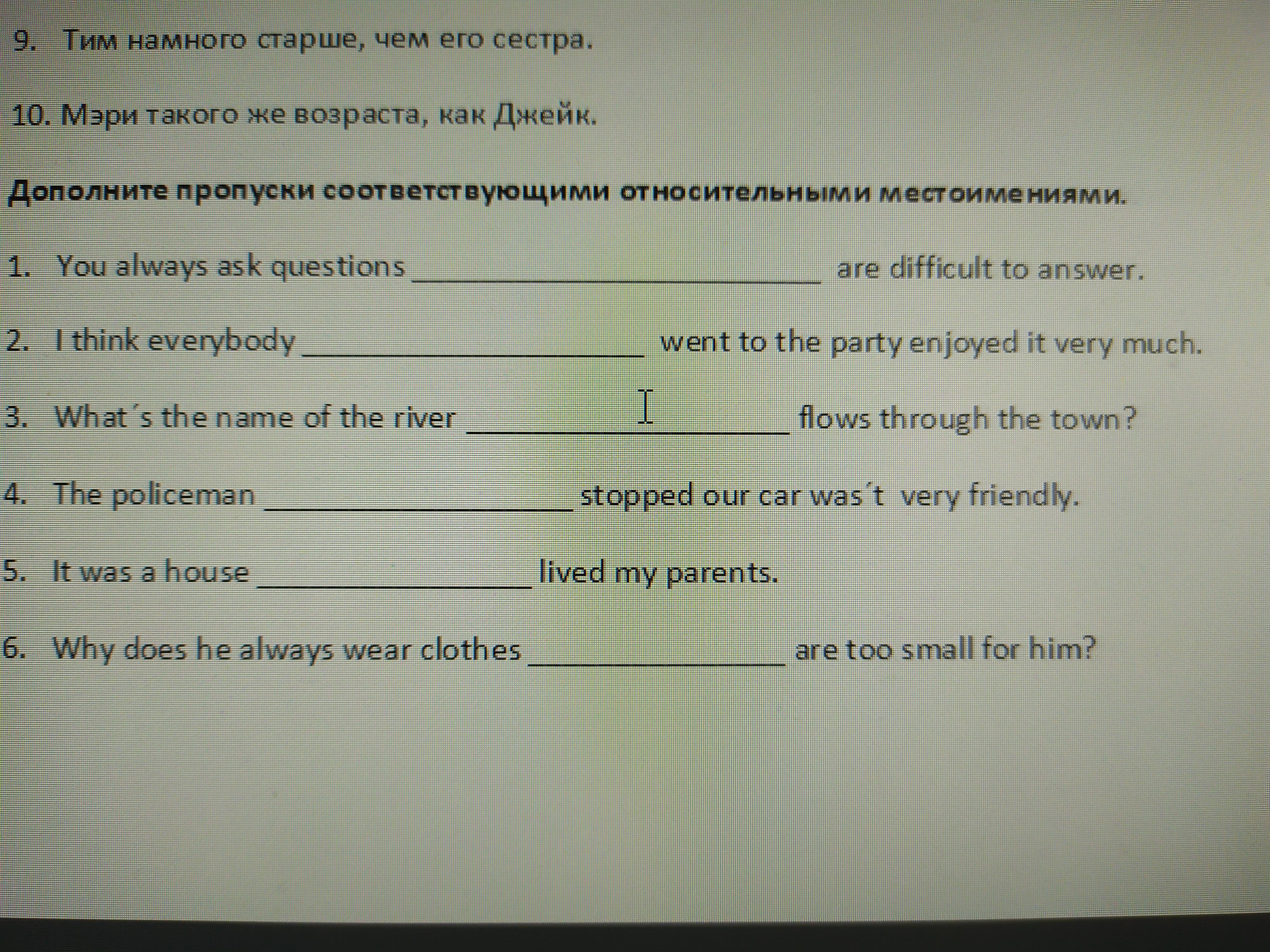 1 which/that 2 who 3 which 4 who/that 5 where 6 which/that