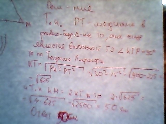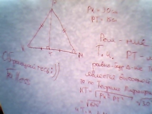 KMP равнобедренный треугольник.PT-медиана,проведенная к основанию.Найдите основание KM треуголника KMP,если PK=30 см,PT=15см